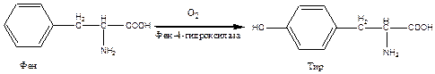 Эта реакция необходима для катаболизма Фен, т.е. удаления его излишков. При отсутствии фен-4-монооксигеназы в организме происходит накопление Фен и превращение его в различные производные: фенилпировиноградную, фенилмолочную и фенилуксусную кислоты. Фен и его производные в высоких концентрациях токсичны, накапливаясь в тканях, они оказывают на них повреждающее действие. Самой чувствительной к Фен и его производным оказывается нервная ткань детей, она поражается в первую очередь. Диагноз фенилкетонурия ставят на основании обнаружения Фен в крови или фенилпировиноградной кислоты на пеленках детей. Лечение в основном сводится к исключению из питания ребенка Фен. Для такого ребенка Тир оказывается незаменимой аминокислотой.