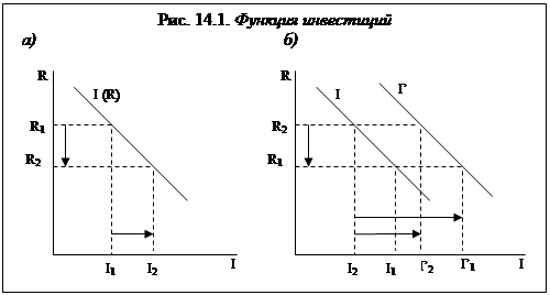 Кривая совокуп-ного инвестици-онного спроса (рис.14.1.(а)) отра-жает эту обратную зависимость вели-чины спроса на инвестиции от ставки процента. Сдвиг кривой совокупных инвестиционных расходов происходит при изменении величины автономных инвестиций (I): их увеличение смещает кривую вправо, а их сокращение - влево. Эти изменения, как правило, представители кейнсианского направления связывают с настроением инвесторов, пессимистической или оптимистической оценкой ожидаемой прибыльности инвестиционных расходов Последствия увеличения уровня автономных инвестиций показано на рис.14.1.(б) сдвигом кривой I вправо до I’. Наклон кривой совокупных инвестиционных расходов обусловлен величиной коэффициента d; чем он выше, т.е. чем более чувствительны инвестиции к изменению ставки процента, тем кривая I более пологая: даже незначительные изменения ставки процента ведут к существенным изменениям величины инвестиционного спроса. · потребительские расходы. Аналогично инвесторам, домохозяйства также используют заемные средства, особенно при покупке потребительских товаров длительного пользования. Потребители сравнивают процентные выплаты по долгу (потребительскому кредиту) с желанием приобрести товар (например, автомобиль или посудомоечную машину) как можно раньше. Высокие процентные ставки заставляют некоторых потребителей отложить покупку до лучших времен и автономные потребительские расходы сокращаются. Таким образом, зависимость между совокупными автономными потребительскими расходами и ставкой процента обратная и все рассуждения и выводы аналогичны тем, которые сделаны относительно инвестиционных расходов (не случайно, некоторые экономисты предлагают рассматривать расходы на потребительские товары длительного пользования как инвестиционные расходы домохозяйств). Таким образом, потребительские расходы зависят не только от уровня располагаемого дохода, но и от ставки процента, и потребительская функция может быть представлена формулой: С = С (Y, Т, t, R) или при линейной зависимости: С = С + mpс (Y – Т- tY) - аR, где С - автономные потребительские расходы, Y - доход, Т- автономные чистые налоги (налоги Tx минус трансферты Tr), mpс – предельная склонность к потреблению (0<mpc<1), показывающая, насколько изменяются потребительские расходы при изменении располагаемого дохода на единицу (mpс=DC/DYd); t – предельная налоговая ставка (t = DT/DY), которая показывает изменение величины налоговых поступлений при изменении величины совокупного дохода на единицу; а - чувствительность автономных потребительских расходов к ставке процента (a>0), отражающая изменение потребительских расходов при изменении ставки процента на один процентный пункт (a=DC/DR), · расходы на чистый экспорт. Изменение ставки процента оказывает влияние и на величину чистого экспорта. Рост процентной ставки в стране повышает доходность вкладываемого капитала и обусловливает приток капитала из-за рубежа. В результате спрос на национальную валюту данной страны на валютных рынках растет, и национальная валюта дорожает. Это ведет к тому, что товары данной страны становятся относительно более дорогими, а импортные товары относительно более дешевыми. Спрос на национальные товары со стороны иностранцев падает, сокращая экспорт, а спрос на иностранные товары растет, увеличивая импорт. Чист