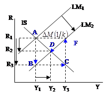 Монетарная политика, инструментом которой выступает изменение предложения денег центральным банком и которая выражается в сдвигах кривой LM, действует на экономику через два эффекта: 1) эффект ликвидности (liquidity effect) и 2) эффект дохода (income effect). Если центральный банк проводит стимулирующую монетарную политику, то с целью увеличения предложения денег он, проводя операции на открытом рынке, покупает государственные ценные бумаги (облигации), что увеличивает резервы коммерческих банков и, следовательно, денежную базу, а это, в свою очередь, с эффектом денежного мультипликатора увеличивает предложение денег. Увеличение предложения денег приводит к падению ставки процента, что объясняется с помощью кейнсианской теории предпочтения ликвидности. При данном уровне дохода рост предложения денег (MS) ведет к тому, что у людей появляется больше денег, чем им требуется для покупки товаров и услуг, поэтому часть наличных денег они используют на покупку ценных бумаг. Спрос на облигации (BD) растет, что приводит к росту их цены (PB), а поскольку цена облигации находится в обратной зависимости со ставкой процента, то ставка процента снижается (МS Ý Þ ВD Ý Þ PB Ý Þ R ß). Если первоначально экономика находится в точке А, то рост предложения денег (DМ) сдвигает кривую LM вправо от LM1 до LM2 на расстояние DМ(1/k) (рис.15.4.(a)). При неизменном уровне дохода (Y1) увеличившееся предложение денег вызывает снижение ставки процента с R1 до R3 (точка В). Такое падение ставки процента в результате увеличения предложения денег получило в экономической теории название «эффекта ликвидности» стимулирующей монетарной политики.