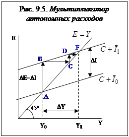 Графическое изображение эффекта мультипликатора расходов (например, мультипликатора инвестиций) представлено на рис.9.5.