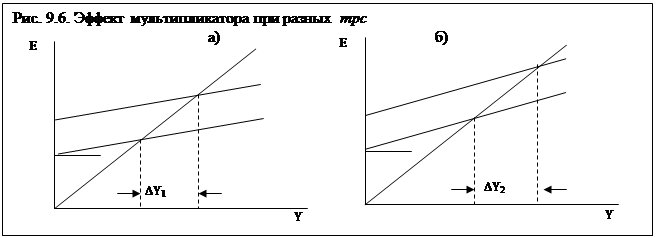 А чем более крутая кривая планируемых расходов (т.е. чем больше mрс и, следовательно, мультипли-катор, тем больший при-рост дохода даст одинаковое увеличение расходов). Это проиллюстрировано на рис.9.6. На рис.9.6 (б) предельная склонность к потреблению (mрс) больше, а поэтому кривая планируемых расходов более крутая и мультипликативный эффект роста дохода при одинаковой величине роста расходов больше (DY2 > DY1), чем на рис.9.6 (а).