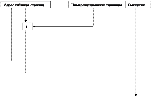 Приведем пример страничного распределения памяти. Виртуальное адресное пространство каждого процесса делится на части одинакового, фиксированного для данной системы размера, называемые виртуальными страницами. В общем случае размер виртуального адресного пространства не является кратным размеру страницы, поэтому последняя страница каждого процесса дополняется фиктивной областью. Вся оперативная память машины также делится на части такого же размера, называемые физическими страницами (или блоками). Размер страницы обычно выбирается равным степени двойки: 512, 1024 и т.д., это позволяет упростить механизм преобразования адресов. При загрузке процесса часть его виртуальных страниц помещается в оперативную память, а остальные - на диск. Смежные виртуальные страницы не обязательно располагаются в смежных физических страницах. При загрузке операционная система создает для каждого процесса информационную структуру - таблицу страниц, в которой устанавливается соответствие между номерами виртуальных и физических страниц для страниц, загруженных в оперативную память, или делается отметка о том, что виртуальная страница выгружена на диск. Кроме того, в таблице страниц содержится управляющая информация, такая как признак модификации страницы, признак невыгружаемости (выгрузка некоторых страниц может быть запрещена), признак обращения к странице (используется для подсчета числа обращений за определенный период времени) и другие данные, формируемые и используемые механизмом виртуальной памяти. Базовый регистр Сгенерированный процессором таблицы страниц виртуальный адрес