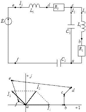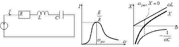 В цепи, в которой включены последовательно конденсатор, катушка индуктивности и конденсатор, возможно возникновение резонанса напряжений при определённых условиях. Ток, текущий в цепи можно найти по формуле: Построим векторную диаграмму по второму закону Кирхгофа:
