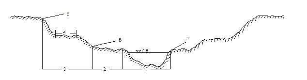 Вода, поступающая на поверхность земли в виде осадков или выходящая из подземных потоков, собирается в понижениях рельефа и стекая под действием силы тяжести, образует поверхностные водотоки. Прежде чем попасть в реки вода собирается в отдельные струйки, которые образуют ручейки и ручьи. Соединяясь, ручьи образуют реки. Система постоянных и временных водотоков представляет собой гидрографическую сеть суши. В строении гидрографической сети выделяют следующие элементы: ложбины, лощины, суходолы и долины. Ложбина – слабо выраженная вытянутая впадина водно-эрозионного происхождения с пологими обычно задернованными склонами. Площадь водосбора ложбин – в среднем от 10 до 50 га. Лощина – следующее после ложбины звено гидрографической сети с большой крутизной и высотой склонов, появлением форм донного и берегового размывов. Площадь водосбора – до 3-5 км2. Суходол – преддолинное нижнее звено гидрографической сети без постоянного водотока, характеризуется ассиметрией склонов, наличием извилистого русла временного водотока. Площадь водосбора - до 10-15 км2. При пересечении дорогой ложбины или лощины, как правило, устраиваются малые водопропускные сооружения. Сток из ложбин отводится в придорожный кювет. Речная долина – относительно узкая, вытянутая в длину пониженная форма рельефа, которая характеризуется общим наклоном своего ложа к устью. Это наиболее полно разработанная водой звено гидрографической сети. Долины встречаясь между собой, никогда не пересекаются, а соединяются вместе в одно целое понижение. По форме поперечного профиля различают долины: каньоны, ущелья, трапецевидные, корытообразные. В зависимости от происхождения: тектонические, вулканические, ледниковые и эрозионные. В составе долины можно выделить следующие части (рис. 2):