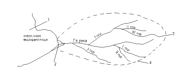 1. Дно или ложе – самая низкая часть долины. Часть ложа, постоянно занятое водой реки, называется руслом. 2. Склоны – повышенные участки долины, ограничивающие с боков ложе. 3. Пойма – затапливаемая в период паводков и половодий часть ложа. 4. Терраса – относительно горизонтальный участок склона. Места сопряжения дна долины со склоном называется подошвой склона, характеризуется более или менее заметным изломом в поперечном профиле долины. Зона сопряжения склонов долины с прилегающей местностью называется бровкой. Линия сопряжения поверхности воды с берегом называется урезом воды. Речная сеть, как правило, имеет древовидную структуру. Реки, впадающие в океан, море или озеро называются главными. Притоки главной реки по отношению к ней являются притоками первого порядка. Притоки, впадающие в притоки первого порядка, являются притоками второго порядка и т.д. (рис.3)