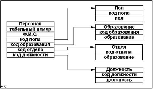 В настоящее время используются реляционные базы данных, в основе которых лежат иерархически связанные таблицы и внутренняя система кодирования информации. Реляционные БД содержат связанные справочные таблицы для хранения данных: Все таблицы связаны друг с другом через ключевые поля. Для связи между таблицами используются поля: код пола, код образования, код отдела, код должности.