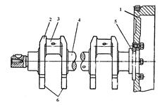 Коленчатый вал относится к числу наиболее ответственных, напряженных и дорогостоящих деталей двигателя. При работе двигателя вал нагружается силами давления газов, а также силами инерции движущихся возвратно-поступательно и вращающихся деталей, вызывающими значительные напряжения кручения и изгибные напряжения. Кроме того, возникают напряжения от крутильных колебаний. Шейки вала испытывают переменное давление, обусловливающее значительную работу трения и износ шеек. Вследствие этого коленчатый вал двигателя должен обладать высокой прочностью, жесткостью и износостойкостью трущихся поверхностей (шеек) при относительно небольшой массе (масса вала составляет 7–15% массы двигателя). Коленчатые валы изготовляют обычно из качественных углеродистых или легированных сталей ковкой или штамповкой. Применяют также литые валы из высокопрочного чугуна и стали. На рис. 1.19 показана конструкция коленчатого вала двигателя. Коленчатый вал имеет коренные 4 и шатунные 3 шейки. Последние расположены под определенным углом одна к другой. Щеки 2 вала выполнены как одно целое с противовесами 6. В шатунных шейках имеются полости для дополнительной центробежной очистки масла. Осевые силы воспринимаются полукольцами, расположенными в расточке блок-картера и крышке коренного подшипника. К фланцу 5 крепится маховик 1. Относительное расположение колен на валу должно удовлетворять требованиям равномерности хода и уравновешенности двигателя.