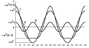 На рис. 1.23 даны кривые ускорения поршня по углу поворота коленчатого вала. Анализ показывает, что максимальное значение ускорения имеет место при нахождении поршня в ВМТ. При положении поршня в НМТ величина ускорения достигает минимального (наибольшего отрицательного) противоположного по знаку значения и абсолютная величина его зависит от?.