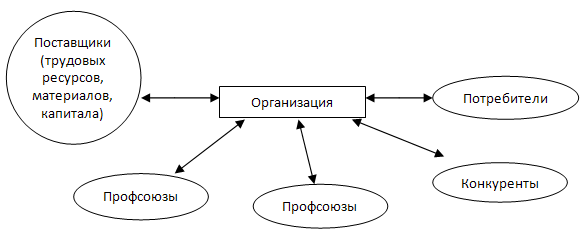 Рис. 5.9. Среда прямого воздействия Поставщики. Организация - это механизм преобразования входов в выходы. Основные разновидности входов - это материалы, оборудование, капитал, рабочая сила. Зависимость между организацией и сетью поставщиков, обеспечивающих ввод указанных ресурсов, - один из наиболее ярких примеров прямого воздействия среды на операции и успешность деятельности организации. Потребители. Само выживание и оправдание существования организации зависит от ее способности находить потребителя результатов ее деятельности и удовлетворять его запросы. Значение потребителей для бизнеса очевидно. Не случайно говорят: "Потребитель - король на рынке". Конкуренты - это внешний фактор, влияние которого невозможно оспаривать. Руководство каждого предприятия понимает, что если не удовлетворять нужды потребителей так же эффективно, как это делают конкуренты, предприятию долго не продержаться на плаву. Законы и государственные органы. Каждая организация имеет определенный правовой статус, являясь единоличным владением, компанией, корпорацией и т.д., и именно это определяет, как организация может вести свои дела и какие налоги должна платить. Состояние законодательства часто характеризуется не только его сложностью, но и подвижностью, а иногда даже и неопределенностью. Организации обязаны соблюдать не только федеральные и штатные законы, но и требования органов государственного регулирования. Эти органы обеспечивают принудительное выполнение законов в соответствующих сферах своей компетенции, а также вводят собственные требования, зачастую также имеющие силу закона. Среда косвенного воздействия - это факторы, не оказывающие прямого воздействия на операции организации, но все же сказываются на них опосредственно. Среда косвенного воздействия обычно сложнее, чем среда прямого воздействия.