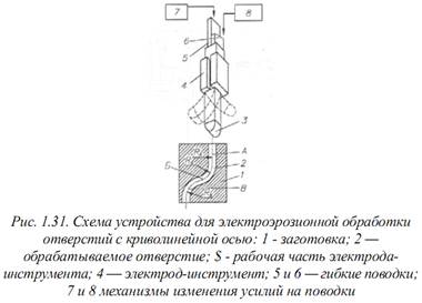 С помощью второго способа можно изготавливать детали имеющие отверстия с криволинейной осью. Обработка в детали 1 (рис. 1.31) отверстия 2 выполняется не жестким электродом-инструментом, рабочая часть которого связана с гибкими поводками 5 и 6. На эти поводки действуют усилия, соотношения которых задается исходя из условия обеспечения заданной кривизны отверстия на определенном его участке. При равенстве усилий на поводке 5 и 6 электрод-инструмент получает прямолинейное движение, обрабатывая участок А отверстия. При различных усилиях рабочая часть 3 электрода-инструмента поворачивается, формируя криволинейный участок Б или В отверстия. Для соответствующего изменения усилий на поводке 5 и 6 применяется программируемые механизмы 7 и 8 с электрогидравлическим или электромеханическим приводом.