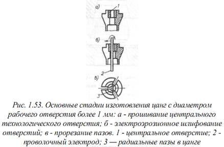 Расчет режимов обработки ведут с расчетом отсутствия микротрещин. Обработку цанг с диаметром рабочего отвесртия более 1 мм выполняют так: · прошивают центральное отверстие 1 (рис. 1.53.а) · Через полученное отверстие пропускают проволоку 2 (рис. 1.53.б) и перемещают ее радиально до касания с образующей отверстия, затем с помощью специального приспособления цангу вращают, а проволоку подают по радиусу отверстия, выполняя электроэрозионное шлифование до нужного размера · Прекращают вращение цанги и включают движение подачи детали вдоль оси паза 3 (рис. 1.53.в). Отключают напряжение и проволоку возвращают в центр отверстия, поворачивают цангу на 120° и прорезают следующий паз, аналогично получают третий паз. Это обеспечивает высокую соосность рабочего отверстия и посадочного диаметра по которому цанга устанавливается на станке, что обеспечивает точность обработки деталей по 6-8 квалитету.