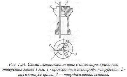 С помощью ЭЭО проволочным электродом получают пазы с винтовым профилем. Для этого проволока 3 (рис. 1.55) пропускается через трубку 1 с наружной изоляцией 2. Ее диаметр меньше чем отверстие во вставке 4. Проволочным электродом прорезают паз во вставке 4, при этом трубка 1 входит в внутрь отверстия вставки. Поступательно перемещая проволоку вдоль оси вставки и одновременно поворачивая цангу вокруг оси получают паз прорезанный у винтовой линии.
