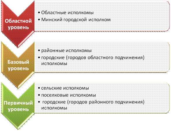 Исполнительные комитеты – это коллегиальные государственные органы, которые осуществляют исполнительную власть в рамках административно-территориальных единиц. Исполнительные комитеты, таким образом, в отличие от местных Советов депутатов входят в исполнительную ветвь власти. Существуют такие же территориальные уровни исполкомов, как и уровни местных Советов депутатов. Нижестоящие исполкомы подотчетны и подконтрольны вышестоящим исполкомам и Президенту. Областные и Минский городской исполкомыподотчетны и подконтрольны также Правительству, но лишь по вопросам, входящим в компетенцию Правительства. Из Конституции Беларуси следует, что исполкомы подотчетны и местным Советам депутатов по ряду вопросов (например, по вопросам исполнения бюджета).