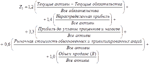 Двухфакторная модель не обеспечивает комплексной оценки финансового положения организации. Поэтому зарубежные аналитики используют пятифакторную модель (Z5) Эдварда Альтмана. Она представляет собой линейную дискриминантную функцию, коэффициенты которой рассчитаны по данным исследования (1968 г.) совокупности из 33 компаний.