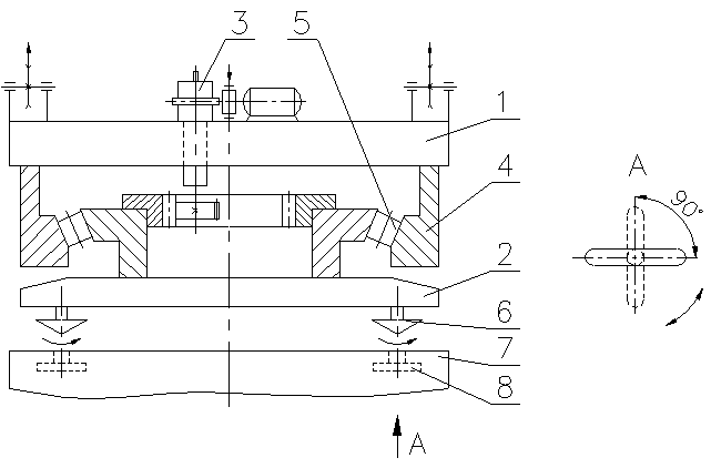 Малюнок – Схема спредера 1 – неповоротна рама спредера; 2 – поворотна рама спредера; 3 – привод повороту поворотної рами 2; 4 – опорно-поворотний пристрій з радіально-завзятим роликовим підшипником 5; 6 – кутове поворотне захоплення (замок) з Т-образными голівками. Багнети повертаються спеціальним приводом, установленим на спредері; 7 – контейнер; 8 – кутовий фитинг контейнера для захоплення. При захопленні контейнера Т-образные голівки замків повинні бути введені в отвори верхніх фитингов і повернені на 90°. Для одночасного уведення всіх чотирьох загарбних голівок в отвори верхніх фитингов спредер повинний бути орієнтований на контейнері за допомогою напрямних на рамі. На кожній з подовжніх балок спредера розташовані дві тверді напрямні, а на поперечних – дві відкидні. Підвіску спредера здійснюють на чотирьох поліспастах. На рамі спредера мається шестеренний насос для гідроциліндрів поворотних замків захоплення і відкидної напрямних спредера. Насос приводиться в дію електродвигуном (Р»1,5квт), харчування якого здійснюється за допомогою гнучкого кабелю. Власна маса спредера значна. Так при вантажопідйомності контейнерів 20т mСПР»3т. Відповідно вантажопідйомність крана приймають до 30т. Технічна характеристика QНОМ(на канатах)=40т QСПРЕДЕРА=32т; (для контейнерів масою 30т) RМАХ. КОНС.=35м; VП=40м/хв П=30конт/година RТЫЛ. КОНС.=12,5м; VТ=120м/хв mК=58,5т Н=30м; VК=43м/хв
