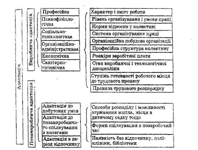 Рис.2. Види адаптації і чинники, які на неї впливають Виробнича адаптація. Сутність її полягає в дії виробничих форм і методів організування праці, особливостей трудового колективу та інших факторів на процес набуття новим працівником необхідних трудових навичок. її складовими є професійна, психофізіологічна, соціально-психологічна, організаційно-адміністративна, економічна і санітарно-гігієнічна адаптація. Професійна адаптація полягає в активному освоєнні навичок своєї професії, її специфіки, оволодінні прийомами і способами прийняття рішень у стандартних і нестандартних ситуаціях. Вона покликана сприяти пристосуванню працівника до психологічних і організаційно-технічних особливостей його професійної діяльності на виробництві, успішному професійному становленню. Психофізіологічна адаптація є процесом звикання до умов, режиму праці і відпочинку. Як правило, вона дається непросто випускникам навчальних закладів, яким доводиться переходити до режиму регламентованого робочого дня. Для працівників зі стажем психофізіологічна адаптація не становить особливих труднощів, якщо в них немає проблем зі здоров'ям. Соціально-психологічна адаптація має на меті входження у колектив, опанування норм відносин у ньому. Цей вид адаптації найскладніший, а нездатність новачка вжитися у колектив нерідко спричинює відмову від посади, на яку він претендував. Із метою психологічної підтримки в перший робочий день новачка повинні прийняти перший керівник (заступник керівника) організації разом з керівником структурного підрозділу і побажати плідної праці. Потім керівник структурного підрозділу показує йому робоче місце, знайомить зі співробітниками. бажано при цьому звернути увагу на факти біографії новачка, ознайомити його з традиціями і вимогами (у т. ч. 1 неформальними), які склалися у колективі, порадити, до кого можна звернутися в разі виникнення труднощів у роботі. Перше трудове завдання має ознайомити новачка з роботою, зацікавити його і показати зв'язок особистої праці діяльністю колективу. Не слід давати йому завдання для того, щоб лише заповнити робочий час. Воно повинно відповідати можливостям працівника, бути не спрощеним, але й не надто складним. Це має бути реальне завдання, важливе для загального трудового процесу структурного підрозділу. Даючи завдання, безпосередній керівник повинен переконатися, наскільки правильно зрозумів його новачок. Після виконання завдання необхідно проаналізувати результат, відзначити позитивне в його виконанні, доброзичливо звернути увагу на допущені помилки. Організаційно-адміністративна адаптація покликана допомогти новому співробітнику з'ясувати своє місце і роль у структурному підрозділі. Визначаючи завдання для робочого місця необхідно, щоб вони відповідали фізичним можливостям людини. Неприпустиме нагромадження на одному робочому місці таких завдань, з якими не зможе справитися рядовий працівник середньої кваліфікації. Для нормальної організаційно-адміністративної адаптації працівника слід не тільки чітко визначити його функції на робочому місці, а й пояснити систему службових зв'язків у колективі структурного підрозділу. Бажано, щоб він мав змогу взаємодіяти із досвідченим і комунікабельним працівником. Нового працівника не можна перевантажувати інформацією,