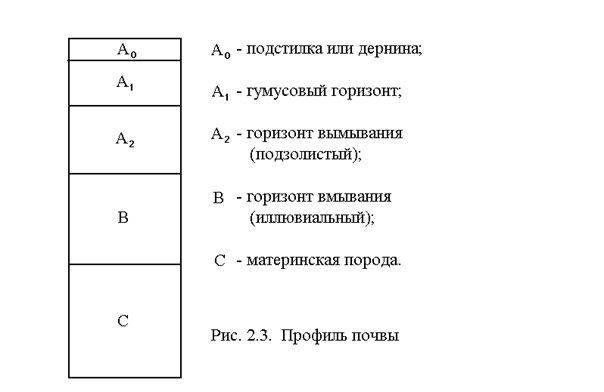Поверхностный горизонт, подстилка или дернина, состоит большей частью из свежеопавших и частично разложившихся листьев, веток, останков животных, грибов и других органических веществ. Окрашен обычно в темный цвет - коричневый или черный. Лежащий под ним гумусовый горизонт А1, как правило, представляет собой пористую смесь частично разложившегося органического вещества (гумуса), живых организмов и некоторых неорганических частиц. Обычно он более темный и рыхлый, чем нижние горизонты. В этих двух верхних горизонтах сконцентрирована основная часть органического вещества почвы и корни растений. О почвенном плодородии многое может сказать ее цвет. Например, темно-коричневый или черный гумусовый горизонт богат органическими веществами и азотом. В серых, желтых или красных почвах органического вещества мало, и для повышения их урожайности требуются азотные удобрения. В лесных почвах под горизонтом А1 залегает малоплодородный подзолистый горизонт А2, имеющий светлый оттенок и непрочную структуру. В черноземных, темно-каштановых, каштановых и других типах почв этот горизонт отсутствует. Еще глубже во многих типах почв расположен горизонт В -иллювиальный, или горизонт вмывания. В него вымываются и в нем накапливаются минеральные и органические вещества из вышележащих горизонтов. Чаще всего он окрашен в бурый цвет и имеет большую плотность. Еще ниже залегает материнская горная порода С, на которой формируется почва. Все горизонты почвы представляют собой смесь органических и минеральных элементов. Свыше 50 % минерального состава почвы составляет кремнезем (SiO2), остальную часть могут составлять глинозем, оксиды железа, магния, калия, фосфора, кальция. Органические вещества, поступающие в почву с растительным опадом, включают углеводы, белки, жиры, смолы, дубильные вещества. Органические остатки в почве минерализуются с образованием более простых веществ (вода, диоксид углерода, аммиак и др.) или превращаются в перегной, или гумус. Посредством почвы - важнейшего компонента биосферы - осуществляются эко-логические связи живых организмов с литосферй, педосферой, атмосферой. Важнейшим свойством почвы является плодородие. Плодородие почвы - это совокупность свойств почвы, обеспечивающая высокую урожайность сельскохозяйственных растений, а также биологическую продуктивность естественных фитоценозов. Плодородие почвы зависит от оптимального содержания в ней питательных веществ (азота, фосфора, калия, микроэлементов), степени увлажненности, правильных методов агротехники, отсутствия вторичного засоления, процессов эрозии и др. Плодородие почвы определяют по наличию в ней гумуса. Гумус - высокомолекулярные темно-окрашенные органические вещества почвы. Состоит из гуминовых кислот, образуется в результате биохимического разложения растительных и животных остатков. Содержит элементы питания растений, которые после разложения гумуса переходят в доступную для них форму. От его качества зависит плодородие почвы. Различают плодородие естественное и искусственное, естественное определяется, в основном природными факторами, а искусственное осуществляется внесением удобрений и проведением; комплекса агротехнических мероприятий (мелиорация, севообороты, снегозадержание, водосберегающие технологии полива и др.). По наличию типо