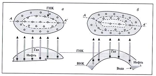 Нефтяная залежь с газовой шапкой В случае изолированной нефтяной залежи с газовой шапкой расположение скважин должно учитывать начальное положение газонефтяного контакта (ГНК) (рис.36 а). Также, как и в случае нефтяной залежи, подстилаемой подошвенной водой, в купольной части залежи, вдоль длинной ее оси, следует пробурить центральный ряд добывающих скважин. Интервал перфорации должен располагаться в нижней части продуктивной толщи. Подобного рода соображения могут быть использованы при расстановке скважин на нефтяной залежи с газовой шапкой и подошвенной водой, но с одним существенным отличием: интервал перфорации в этом случае должен находиться в нижней части структуры и ближе к ВНК, чем к ГНК (рис.36 б).