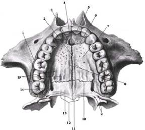 1. Череп в цілому. 2. Поділ черепа на основу і склепіння. 3. Анатомічні утворення, по яких проходить межа між основої і склепінням черепа. 4. Кістки, що формують склепіння черепа. 5. Анатомічна будова склепіння черепа ззовні. 6. Анатомічна будова склепіння черепа зсередини. 7. Кістки, що формують основу черепа. 8. Анатомічні утворення зовнішньої основи черепа, отвори, їх сполучення. 9. Анатомічна будова внутрішньої поверхні основи черепа. 10.Межі, вміст, сполучення передньої черепної ямки. 11.Межі, вміст, сполучення середньої черепної ямки. 12.Межі, вміст, сполучення задньої черепної ямки. 13.Анатомічна будова твердого піднебіння. 14.Межі, стінки, сполучення скроневої ямки. 15.Межі, стінки, сполучення підскроневої ямки. 16.Межі, стінки крилопіднебінної ямки. 17.Сполучення крилопіднебінної ямки. 18.Розвиток мозкового черепа. 19. Розвиток лицевого черепа. 20.Аномалії розвитку мозкового і лицевого черепа. Обсяг самостійної роботи на занятті Студенти самостійно працюють з кістковими препаратами. Самостійно вивчають і демонструють будову черепа в цілому, склепіння, зовнішню та внутрішню основи черепа. Викладач консультує студентів по темі заняття. В кінці заняття викладач шляхом тестування кінцевого рівня знань та вмінь оцінює роботу кожного студента в академічному журналі. Тести для самоконтролю знань. 1. Яким номером на малюнку позначено palatum osseum?
