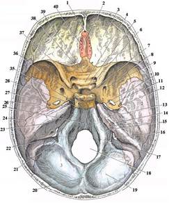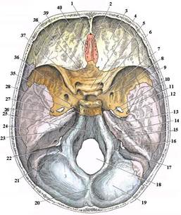 Навчальні цілі заняття: ЗНАТИ: а) анатомічну будову черепа, його поділ; б) анатомічну будову зовнішньої і внутрішньої поверхні склепіння черепа; в) анатомічну будову внутрішньої основи черепа, поділ на черепні ямки; г) межі, вміст і сполучення передньої черепної ямки; д) межі, вміст і сполучення середньої черепної ямки; е) межі, вміст і сполучення задньої черепної ямки; є) анатомічну будову і сполучення зовнішньої основи черепа; ж) анатомічну будову кісткового піднебіння; з) анатомічну будову, стінки та сполучення скроневої ямки; к) анатомічну будову, стінки та сполучення підскроневої ямки; л) анатомічну будову, стінки та сполучення крилопіднебінної ямки.