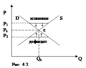 Если же существует избыток спроса или дефицит (при цене Р2), конкуренция покупателей повышает цены и приводит к исчезновению избытка.