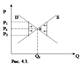 Взаимодействие спроса и предложения, их координация осуществляется на основе ценового механизма и конкуренции. Это приводит к образованию рыночного равновесия и равновесной цены. Рыночное равновесие – это положение на рынке, при котором спрос на товар равен его предложению. Равновесная цена (Рe) – цена, уравновешивающая спрос и предложение в результате действия конкурентных сил (рис. 4.1.).