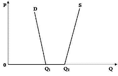 Подобная ситуация означает, что производство данного товара технически возможно, однако спроса на него нет. В этих условиях могут оказаться производители новой и дорогой продукции. Если государство просубсидирует этих производителей и линия предложения опустится (как это изображено пунктирной линией), то покупатели найдутся и их будет тем больше, чем крупнее объем дотаций. Со временем производители могут увеличить эффективность своего производства и необходимость в дотациях отпадет, так как при увеличении эффективности производства линия предложения смещается вправо и вниз. В другом случае краевого равновесия (рис.5.2) линии спроса и предложения пересекаются на оси абсцисс. Такие блага являются бесплатными, т.е. «неэкономическими», о чем уже шла речь в первой главе. Превращение неэкономического блага в экономическое может произойти, во-первых, в результате резкого смещения линии спроса вправо. К примеру, успешная реклама чистейшей байкальской воды и ее продажа на рынке. Во-вторых, неэкономическое благо может стать экономическим, если линия предложения сместится резко влево. Примером может служить во в пустыне. В отличие от случаев краевого равновесия нормальное пересечение линии спроса и предложения принято называть внутренним равновесием. Единственность и множественность равновесия. Если линия спроса имеет традиционный отрицательный наклон, а линия предложения – широко распространенный положительный, то они имеют лишь одну точку пересечения, а значит, единственное равновесие.