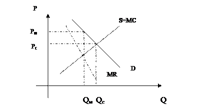 Как отмечалось, рынок совершенной конкуренции является наиболее эффективной формой функционирования экономики, потому что в долгосрочном периоде рыночные цены равны средним общим и предельным издержкам, т.е. Р=АТС= МС. Выясним, как обстоит дело с эффективностью в условиях чистой монополии. Рассмотрим ситуацию, когда конкурентная отрасль превращается в монополию. На рис.11 изображено равновесие на рынке совершенной конкуренции, на котором устанавливается цена Рс и продается Qc единиц продукции. Отраслевое предложение S является суммой предложений всех фирм. Допустим, что конкурирующие фирмы превратились в филиалы монополистического объединения. Кривая отраслевого предложения превратилась в кривую предельных издержек монополиста МСм. Отраслевой спрос D становится спросом на продукцию монополиста. Предельный доход MR м будет лежать ниже кривой спроса. При условии равенства MR и МС монополист произведет QM продукции и установит цену Рм, в результате чего извлечет максимальную прибыль, равную заштрихованной площади. Последствия поглощения монополией конкурентной отрасли заключаются в том, что цена возросла, а отраслевой объем продукции сократился, в результате чего произошло перераспределение дохода от потребителей к монополии.