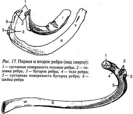 Ребро (costa), 12 пар, состоит из длинной задней костной части и короткой средней хрящевой части (реберного хряща). Семь пар верхних ребер (I—VII) хрящевыми частями соединяются с грудиной и называются истинными. Хрящи VIII, IX, X пар ребер соединяются не с грудиной, а с хрящом вышележащего ребра, такие ребра называются ложными. Ребра XI и XII имеют короткие хрящевые части, которые заканчиваются в мышцах брюшной стенки. Они более подвижные и называются колеблющимися. Ребро имеет головку, тело и шейку. Между шейкой и телом в верхних 10 парах ребер находится бугорок, ребра. У ребра различают внутреннюю и наружную поверхность, верхний и нижний край. На внутренней поверхности ребра по его нижнему краю находится борозда — место, где проходят межреберные сосуды и нерв. На наружной поверхности ребра между телом и шейкой ребра имеется бугорок ребра, суставная поверхность которого сочленяется с поперечным отростком позвонка. Ребра различаются по форме и размерам (рис. 17, 18). Самые короткие — два верхних и два нижних ребра. Первое ребро лежит горизонтально, на его верхней поверхности находятся небольшой бугорок для прикрепления передней лестничной мышцы и две борозды: передняя — для подключичной вены, задняя — для подключичной артерии.