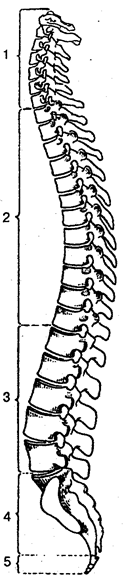 Рис. 19. Позвоночный столб: 1 — шейные позвонки; 2 — грудные позвонки; 3 — поясничные позвонки; 4— крестец; 5— копчик