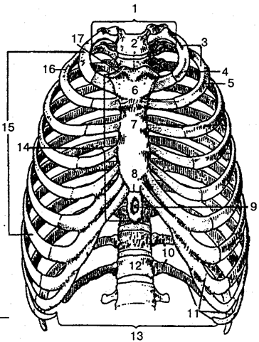 Рис. 20. Скелет грудной клетки (вид спереди): 1 — верхняя апертура грудной клетки; 2 — яремная вырезка; 3 — ребра (1— 12); 4 — первое ребро; 5, 16 — второе ребро; 6 — рукоятка грудины; 7 — тело грудины; 8— сочленение между телом грудины и мечевидным отростком; 9— мечевидный отросток; 10— колеблющиеся ребра (11—12); 11— ложные ребра (8—12); 12— грудной позвонок; 13 — нижняя апертура грудной клетки; 14— грудина; 15— истинные ребра (1—7); 17— ключичная вырезка