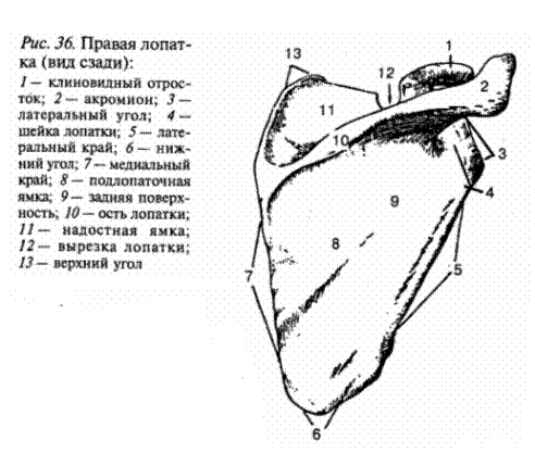 В процессе развития человека скелет конечностей значительно изменился. Верхние конечности приобрели большую подвижность, стали выполнять функцию органов труда, совершать сложные и обширные движения, а нижние — функцию передвижения и опоры, удерживая в вертикальном положении тело человека. В скелете верхней и нижних конечностей человека различают пояс и свободную часть. Пояс верхней конечности состоит из ключицы и лопатки. Свободная часть верхней конечности включает плечевую кость, кости предплечья (лучевая и локтевая), кости кисти (кости запястья, пястные кости и кости пальцев — фаланги). Пояс нижней конечности образуется с парной тазовой костью, которая сочленяется с крестцом и бедренной костью свободной части нижней конечности. Скелет свободной части нижней конечности состоит из бедренной кости, костей голени (большеберцовая и малоберцовая), надколенника и костей стопы (предплюсны, плюсневых костей и костей пальцев — фаланги). Пояс верхней конечности. Лопатка (scapula) — плоская кость треугольной формы, располагается сзади грудной клетки на уровне II—VIII ребер (рис. 36, 37).