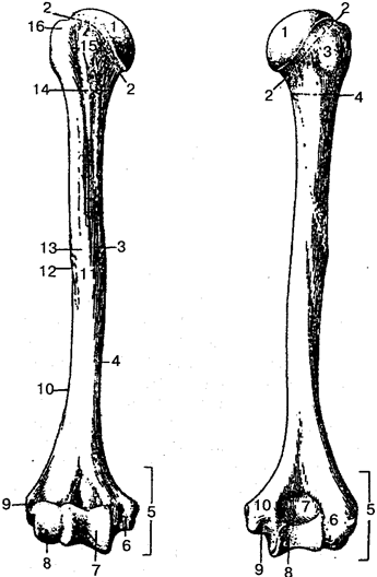 Скелет свободной верхней конечности. Плечевая кость (humerus) относится к длинным трубчатым костям, имеет тело и верхний и нижний концы (рис. 40, 41). Верхний конец, утолщенный, образует головку плечевой кости. По краю головки проходит неглубокая борозда — анатомическая шейка, около нее располагаются большой и малый бугорки, разделенные бороздой. Наиболее тонкая часть между головкой плечевой кости и ее телом называется хирургической шейкой (место частых переломов). Нижний конец плечевой кости расширен, образует мыщелок плечевой кости, по бокам которого находятся два отростка — медиальный и латеральный надмыщелки. Медиальная часть надмыщелка образует блок плечевой кости для соединения с локтевой костью предплечья. Латеральное от блока находится головка плечевой кости, которая имеет соединение с лучевой костью. К большим и малым бугоркам, надмыщелкам и другим образованиям плечевой кости прикрепляются связки и мышцы.