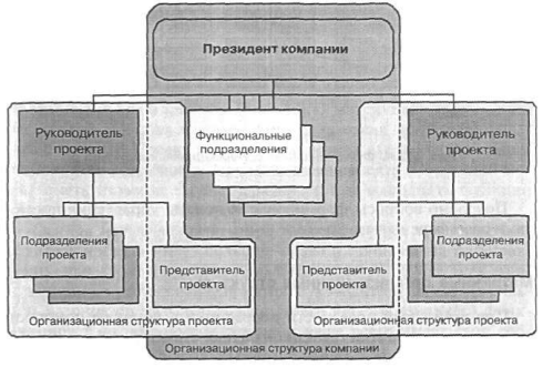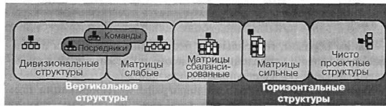 Схема смешанной организации Все разнообразие организационных структур, возможных для управления проектом, можно представить в виде континуума, границы которого обозначают возможные решения по разделению труда — вертикальное (функционально-административное) разделение труда и горизонтальное (проектно-целевое).