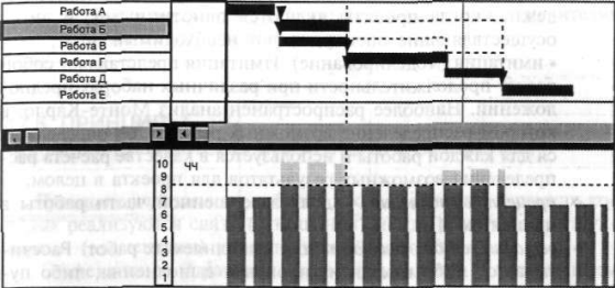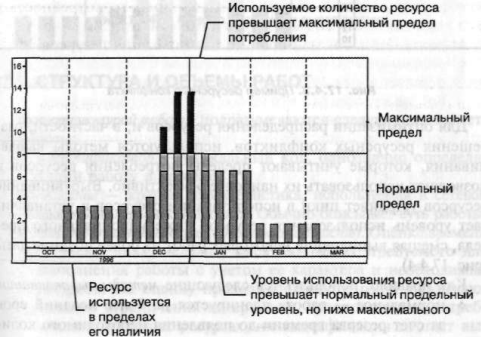 Рис. Пример процесса планирования ресурсов При анализе профилей использования ограниченных ресурсов определяется соответствие между пределами их потребления (возможностью) и потребностью для выполнения работы. В ряде случаев возникает ресурсный конфликт, когда потребность в каком-либо ресурсе превышает его максимальный предел потребления (например, одновременно выполняемые работы используют один и тот же ресурс).