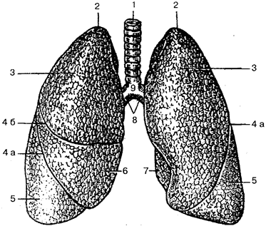 Рис. 80. Трахея, главные бронхи и легкие: 1 — трахея; 2 — верхушка легкого; 3 — верхняя доля; 4 а — косая щель; 46— горизонтальная щель; 5— нижняя доля; 6— средняя доля; 7— сердечная вырезка левого легкого; 8 — главные бронхи; 9 — бифуркация трахеи