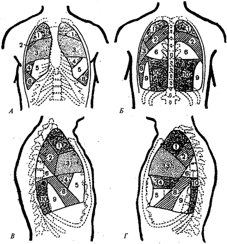 Рис. 81. Схема сегментов легкого: А — вид спереди; Б — вид сзади; В — правое легкое (вид сбоку); Г— левое легкое (вид сбоку)