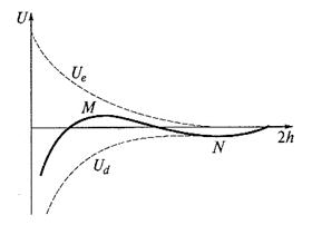 ^ Рис. Изменение энергии (U) тонкой пленки электролита в зависимости от ее толщины (h) Как видно из рисунка, Ue изменяется по экспоненциальному закону (пропорциональна e - æh ), Ud – по степенному (пропорциональна 1 /h2). Поэтому на малых расстояниях будет преобладать притяжение (при h → 0 Ud → ∞). На больших расстояниях также преобладает притяжение, т. к. степенная функция убывает медленнее, чем экспонента. На средних расстояниях возможен локальный (дальний) максимум. Он соответствует энергетическому (потенциальному) барьеру, который препятствует сближению частиц и их коагуляции. Анализ уравнения и графика позволяет выделить три случая поведения дисперсной системы в зависимости от соотношения высоты энергетического барьера UM, глубины потенциальной ямы UN на больших расстояниях, и на малых расстояниях энергии тепловых колебаний kБT. (Проведите этот анализ!)