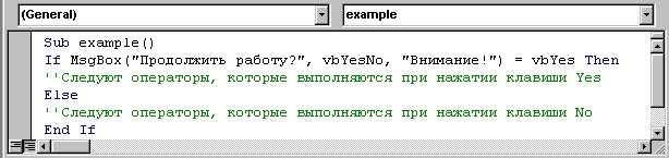 Чтобы добавить в проект модуль, выбираем ВСТАВКА®МОДУЛЬ. В окне редактора кода появится новый модуль, а имя его отобразится в окне проекта. Для написания процедур для обработки элементов пользовательского проекта, делаем двойной щелчок по названию элемента в окне проекта и в окне редактора кода выбираем нужную процедуру. Для осуществления диалога с пользователем, в программах можно использовать две функции: ü Окно текстового сообщения MsgBox (Prompt, Buttons, Title) Где Prompt - сообщение для пользователя, Buttons - кнопки, которые должны появится в данном окне, Title - заголовок окна. Результатом функции является нажатая кнопка на появившемся окне. Например, следующее сообщение позволяет узнать у пользователя: следует ли продолжить работу далее или стоит выйти из программы?