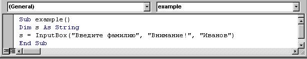 ü Окно для ввода текстовой информации InputBox (Prompt, Title, Default) Где Prompt - сообщение для пользователя, Title - заголовок окна, Default – значение в текстовом поле по умолчанию. Результатом функции является введенный пользователем текст. Например, с помощью данной функции предложим пользователю ввести фамилию.