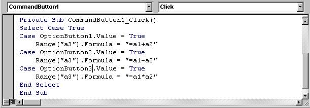 OptionButton (переключатель) – позволяет пользователю выбрать один из нескольких взаимно исключающих параметров. По умолчанию все переключатели на рабочем листе объединены в одну группу. Чтобы объединить несколько переключателей в новую группу, надо в диалоговом окне «Свойства» в строке GroupName установить название новой группы. ü Caption – текст, отображаемый рядом с переключателем; ü Value – устанавливает или возвращает состояние переключателя (True, False); Пусть имеется группа из 3-х переключателей. Требуется в зависимости от выбора переключателя, при нажатии на кнопку, осуществлять определенное арифметическое действие над двумя ячейками.