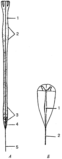 Рис. 100. Спинной мозг (схема): А: 1 — спинной мозг: 2 — шейное утолщение; 3 — пояснично-крестцовое утолщение; 4 — мозговой конус; 5 — концевая нить; Б: 1 — концевой желудочек; 2 — концевая нить Как рефлекторный центр спинной мозг способен осуществлять сложные двигательные и вегетативные рефлексы. Афферентными (чувствительными) путями спинной мозг связан с рецепторами, а эфферентными — со скелетной мускулатурой и со всеми внутренними органами. Длинные нисходящие и восходящие пути спинного мозга соединяют периферические части тела с головным мозгом. По внешнему виду спинной мозг представляет собой продолговатый, несколько плоский цилиндрический тяж. Он расположен в позвоночном канале и на уровне нижнего края большого затылочного отверстия переходит в головной мозг. Нижняя граница спинного мозга соответствует уровню I— II поясничных позвонков. Ниже этого уровня он продолжается в тонкую терминальную (концевую) нить. У взрослого человека длина спинного мозга в среднем составляет около 43 см (у мужчин 45 см, у женщин 41— 42 см), масса — около 34—38 г. Как и позвоночник, спинной мозг имеет шейный и грудной изгибы, а также шейное и по-яснично-крестцовое утолщения. В связи с метамерностью строения тела человека он делится на сегменты, или нейромеры (рис. 101). Сегмент — это участок спинного мозга, который соответствует паре спинномозговых нервов.