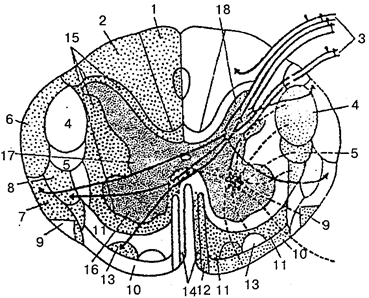 Рис. 104. Проводящие пути белого вещества на поперечном срезе спинного мозга (схема): 1 — тонкий пучок; 2 — клиновидный пучок; 3 — задний корешок; 4 — латеральный корково-спинномозговой (пирамидный) путь; 5 — красноядерно-спинномозговой путь; 6— задний спинно-мозжечковый путь; 7— передний спинно-мозжечковый путь; 8—латеральный спинно-таламический путь; 9 — оливоспинномозговой путь; 10 — преддверно-спинномозговой путь; 11 — ретикулярно-спиниомозговой путь; 12 — передний корково-спинномозговой (пирамидный) путь; 13 — передний спинно-таламический путь; 14 — покрышечно-спинномозговой путь; 15 — задний боковой и передний собственные пучки; 16— передний рог; 17—боковой рог; 18— задний рог Боковой канатик спинного мозга содержит следующие проводящие пути: 1) задний спинно-мозжечковый — несет проприоцептивные импульсы в мозжечок; 2) передний спинномозжечковый — идет в кору мозжечка; 3) латеральный спинно-таламический — проводит импульсы болевой и температурной чувствительности; 4) латеральный корково-спинномозговой (пирамидный) — проводит двигательные импульсы от коры большого мозга к спинному мозгу; 5) красноядерно-спинномозговой — проводит импульсы автоматического (подсознательного) управления движениями и. поддерживает тонус скелетных мышц. Задний канатик содержит пути сознательной проприоцептивной чувствительности (сознательное суставно-мышечное чувство), которые направляются в головной мозг и корковый конец двигательного анализатора, передают информацию о состоянии тела, его частей в пространстве. На уровне шейных и верхних грудных сегментов спинного мозга задние канатики промежуточной бороздой делятся на два пучка — тонкий пучок Голля и клиновидный пучок Бурдаха. Спинной мозг окружают три оболочки: твердая, паутинная и мягкая (рис. 105).