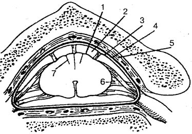 Рис. 105. Оболочки спинного мозга: 1 — мягкая оболочка спинного мозга; 2 — подпаутинное пространство; 3 — паутинная оболочка спинного мозга; 4 — твердая оболочка спинного мозга; 5 — эпидуральное пространство; 6 — зубчатая связка; 7 — промежуточная шейная перегородка