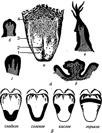 Рис. 151. Сосочки языка. Вкусовые поля языка: А — сосочки языка; а — общий вид; б — грибовидный сосочек; в — нитевидный сосочек; г — листовидный сосочек; д — желобовидный сосочек (/ — грибовидные сосочки; 2— нитевидные сосочки; 3 — листовидные сосочки; 4— желобовидные сосочки); Б — вкусовые поля языка