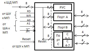 Работа ППА заключается в следующем: Задание портов ввода/вывода путем засылки в регистр РУС управляющего слова (УСР). УСР определяет порты ввода/вывода. Каждый порт имеет свой адрес, который определяется ША. Кроме того есть линия, по которой передаются сигналы чтения записи с портов (RD,WR). Линия ВК (разряд в ША), которая определяет выбор конкретного ППА. Начало работы ППА осуществляется формированием управляющего слова режима УСР, которое на программном уровне засылается в РУС.