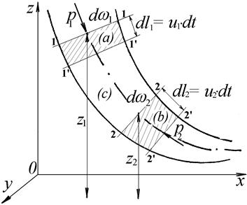 Для невязкой жидкости к выделенному объёму приложены силы тяжести, давления жидкости на боковую поверхность, силы давления на торцевые площадки w1 и w2. Поскольку жидкость несжимаема, внутренняя энергия рассматриваемого объёма не меняется при его перемещении и в уравнение кинетической энергии входит только работа внешних сил. При перемещении массы из положения 1-1, 2-2 в положение 1¢-1¢, 2¢-2¢ вес жидкости в объёме (с) работу не совершает и работу сил тяжести можно вычислить как работу перемещения из объёма (а) в (b). Сила тяжести равна: