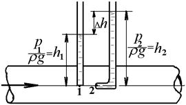 В данном случае z1 = z2, u1 = u, а u2 = 0, так как при обтекании жидкостью трубки в точке 2 происходит уменьшение скорости u до нуля и в соответствии с этим увеличение давления. Тогда
