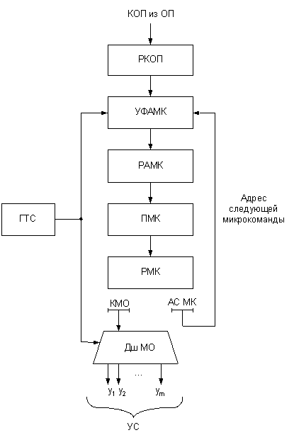 КМО дешифрируется и преобразуется в набор управляющих сигналов y1…ym, управляющих функционированием процессора. Адрес следующей микрокоманды поступает в УФАМК, в результате чего производится выборка следующей МК. Рассмотренный БМУ использует принудительную адресацию МК. БМУ такого типа используются чаще всего. Кроме них используются и БМУ с естественной адресацией, в которых для задания адресов МК используется счетчик микрокоманд Сч МК.