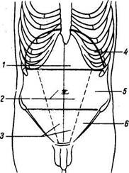 mesogastrium (средняя область живота, чревье) и hypogastrium (подчревье) (рис. 4). Каждый из трех отделов живота подразделяется посредством двух вертикальных линий еще на три вторичные области, причем epigastrium разделяется на среднюю часть — r'egio epigastrica (надчревная область) и две боковые, regibnes hypochondriacae — d'extra et sinistra (подреберные области, подреберья). Средняя область живота таким же образом делится на срединно расположенную пупочную область — r'egio umbilicalis и две боковые области живота — regibnes laterales (dext. et sin.). Наконец, hypogastrium разделяется на r'egio pubica (лобковая область) и две regibnes inguinales — dext. et sin. (паховые области), лежащие по бокам. Областями спины являются позвоночная — regio vertebralis, лопаточные — regibnes scapulares (dext. et sin.), подлопаточные — regibnes subscapulares и дельтовидная — regio deltoidea. Верхняя конечность делится на плечо — brachium, предплечье — antebrachium и кисть — minus; в последней различают области ладони — palma manus, тыла — dbrsum manus и пальцы — digiti manus. Нижняя конечность в свою очередь разделяется на следующие области: ягодичную — regio glute'a-Us, бедро — femur, голень — eras и стопу — pes, которая подразделяется на подошву — planta, тыл стопы — dbrsum pedis и пальцы — digiti pedis. Средняя длина тела взрослых (20 — 60 лет) равна у мужчин 165 см, у женщин — 154 см. Рост тела в длину прекращается у женщин в 16—17 лет, у мужчин — в 18 — 19. Пропорции тела зависят от возраста и пола. В процессе развития плода у него сначала усиленно растут верхние отделы тела, а после рождения — нижние. Вот почему после рождения высота головы увеличивается только в 2 раза, длина туловища — в 3 раза, рук — в 4, а ног — в 5 раз. Половые различия в пропорциях тела: у женщин несколько уже плечи и значительно шире таз, немного короче руки и ноги, а туловище длиннее. Половые признаки, отличающие мужчину от женщины, делятся на первичные и вторичные. К первичным относятся органы размножения, в первую очередь половые железы, наличием которых определяется пол; остальные признаки относятся ко вторичным. У женщин меньше рост (в среднем на 12 см) и масса тела. Средняя масса тела взрослого мужчины на территории СССР равна 66 кг, женщины — 59 кг. Индивидуальные колебания массы тела составляют 18 — 25 кг относительно средней величины. Грудная клетка у женщины короче и уже мужской, вследствие чего, а также благодаря большему наклонению таза живот у женщины длиннее. Общее количество мышечной массы у мужчин в среднем составляет 40 % от всей массы тела, тогда как у женщины только 32 %, в результате чего физическая сила женщины в общем меньше мужской. У женщины жировая ткань развита гораздо обильнее, чем у мужчины. Характерным вторичным половым признаком у женщины является присутствие развитых молочных желез, которые у мужчины находятся в зачаточном состоянии. Кожа мужчины толще и грубее, к тому же более волосиста (особенно на лице). Конституция. Вышеустановленное общее понятие «организм» не отражает целиком содержания, связанного с понятием о конкретном организме или индивидууме, с которым фактически приходится иметь дело как при изучении анатомии, так и врачу у постели больного. Под конституцией обычно подразумевается комплекс индивидуальных, относящихся только к данному человеку физиологических и морфологических особенностей, складывающихся в определенных социальных и природных условиях и проявляющихся в реакции организма на различные (в том числе и патологические) воз